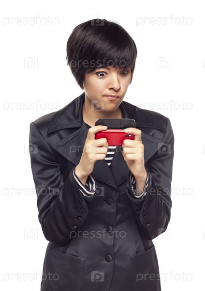 Выразительная девушка смешанного происхождения с сотовым телефоном на белом фоне