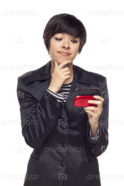 Выразительная девушка смешанного происхождения с сотовым телефоном на белом фоне