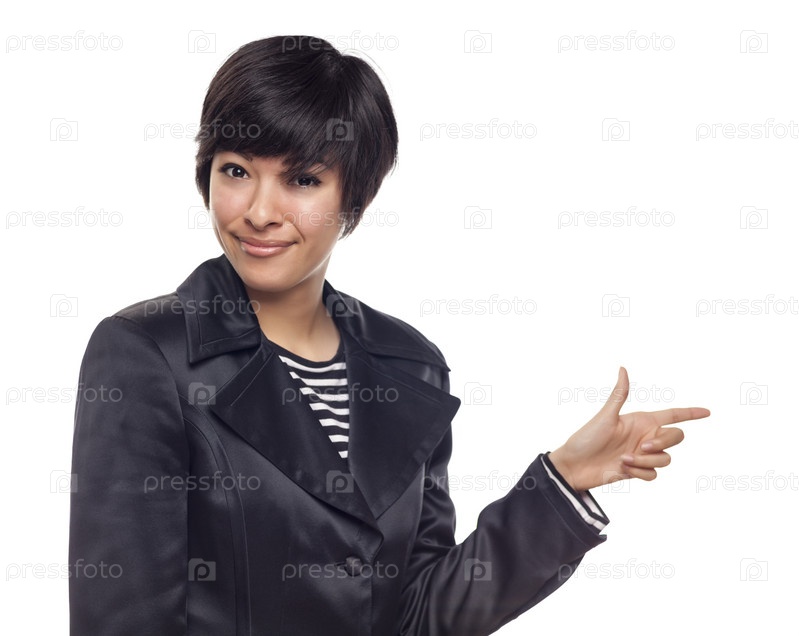 Девушка смешанного происхождения указывает в сторону на белом фоне
