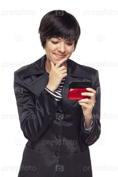 Выразительная девушка смешанного происхождения с сотовым телефоном на белом фоне