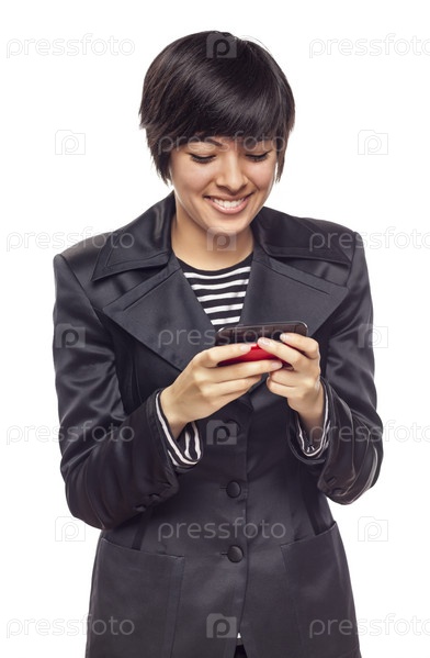 Выразительная девушка смешанного происхождения с сотовым телефоном на белом фоне