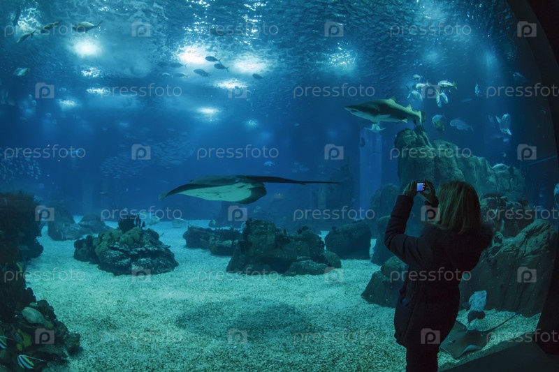Португалия, Лиссабон, Лиссабонский океанариум, турист фотографирует тропических рыб
