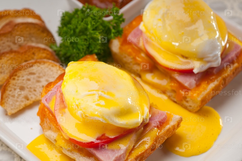 Яйца бенедикт на хлебе с помидорами и ветчиной