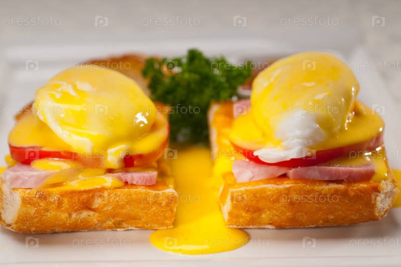 Яйца бенедикт на хлебе с помидорами и ветчиной