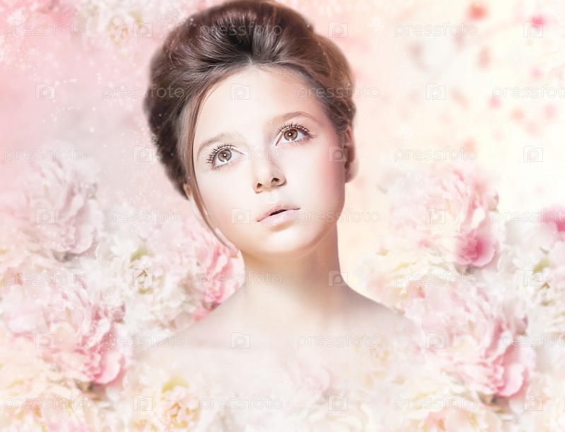 Красивая женщина с естественным макияжем на цветочном узоре из роз