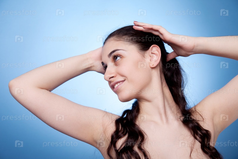 Портрет молодой женщины на голубом фоне