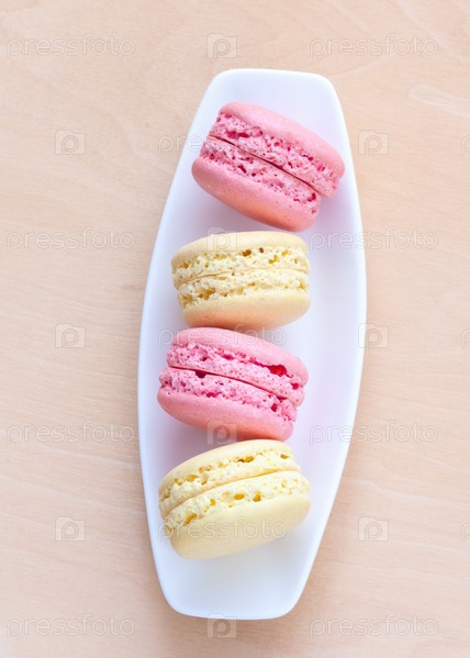 Розовое и желтое миндальное печенье на тарелке