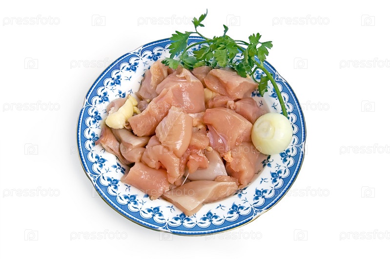 Филе курицы, нарезанное крупными кусками на тарелке с луком и петрушкой