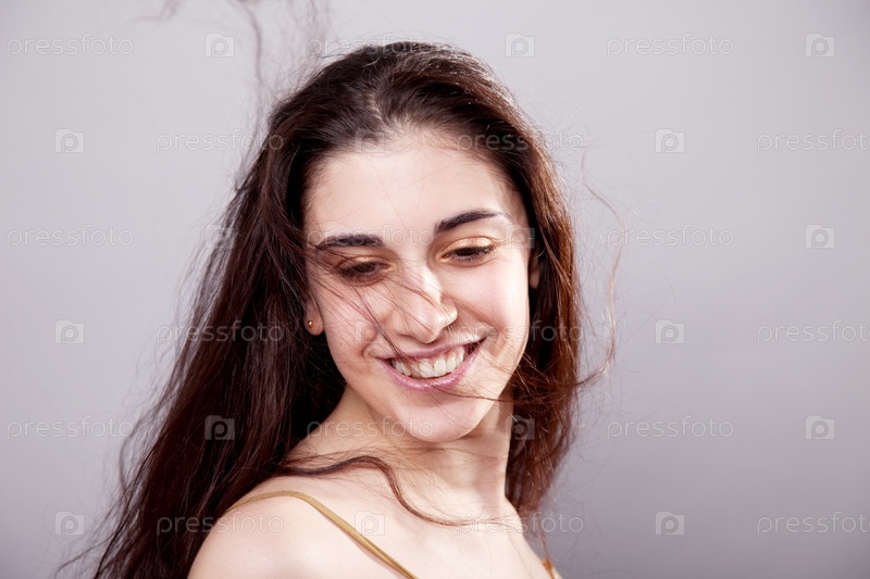 Портрет молодой женщины на сером фоне