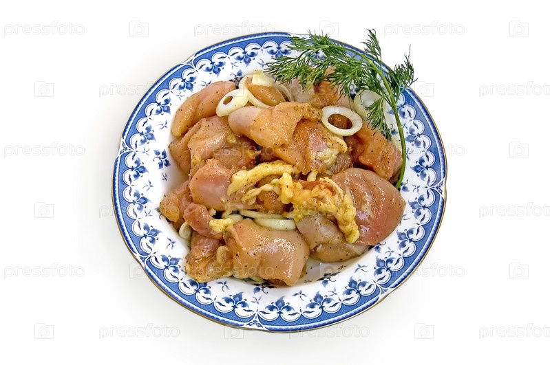 Куриное филе со специями, укропом и репчатым луком кружочками на тарелке на белом фоне
