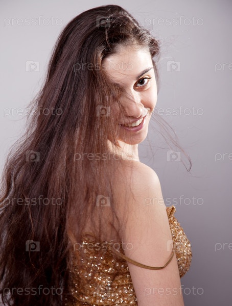 Портрет молодой женщины на сером фоне