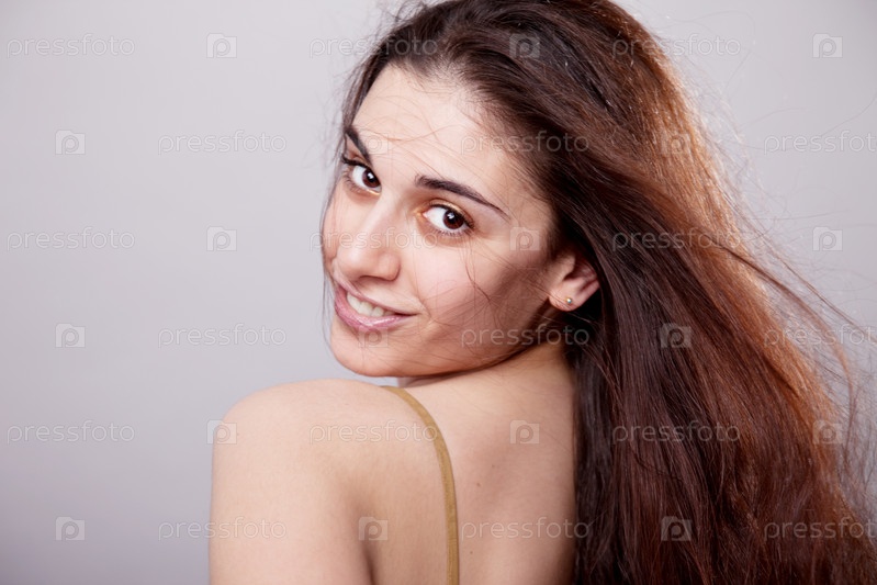 Портрет молодой женщины на сером фоне