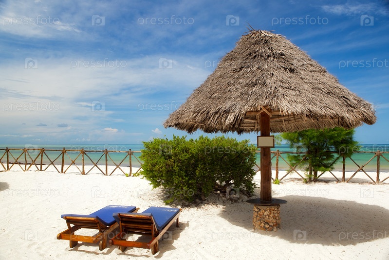 Шезлонги под зонтиком на берегу
