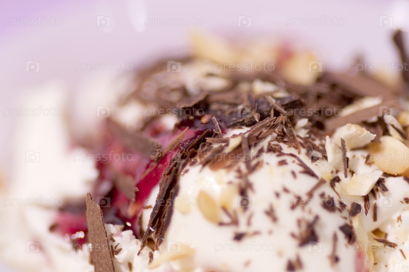 Десерт со сметаной, шоколадом, вареньем и орехами