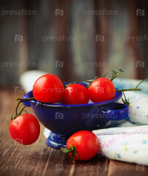 Красные помидоры в голубой тарелке