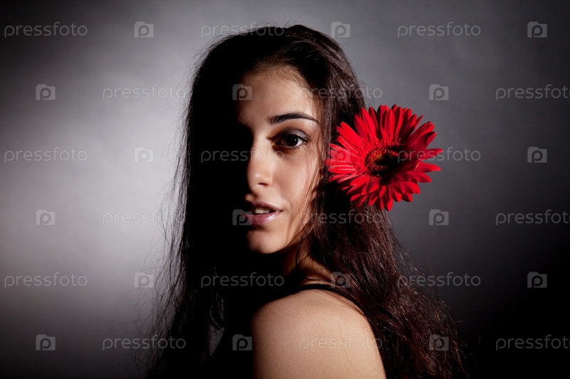 Привлекательная женщина с красным цветком на темном фоне
