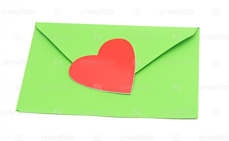 Конверт из зеленой бумаги с красным сердцем крупным планом