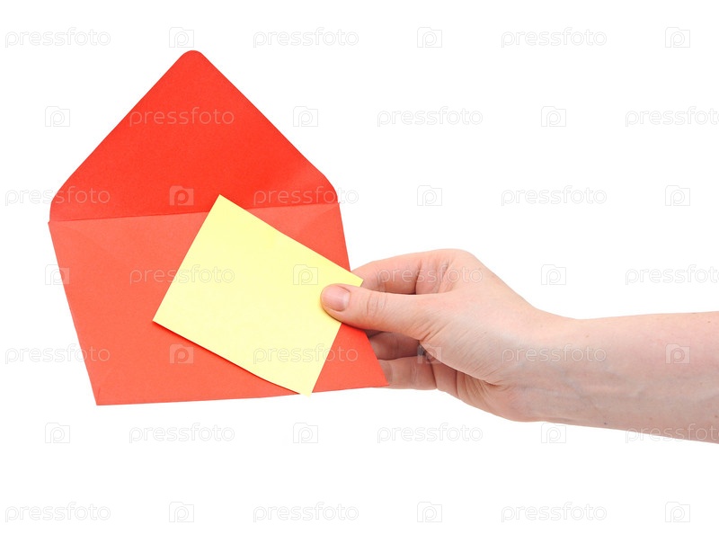 Красный конверт в руке, изолированный на белом фоне