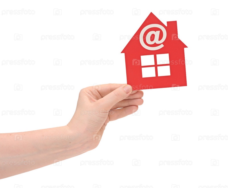Женская рука с красным пластиковым домиком с иконкой электронной почты на белом фоне
