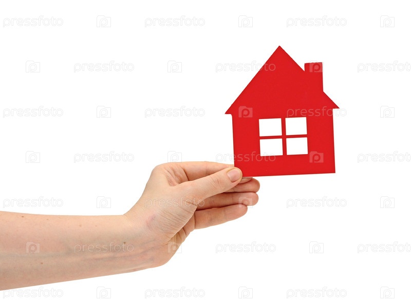 Женская рука с красным пластиковым домиком на белом фоне