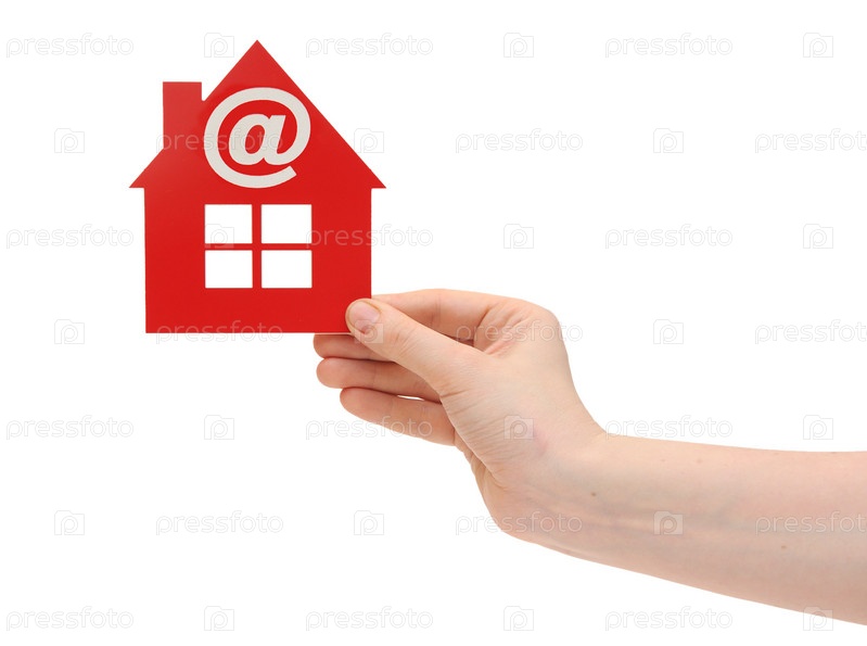 Женская рука с красным пластиковым домиком с иконкой электронной почты на белом фоне