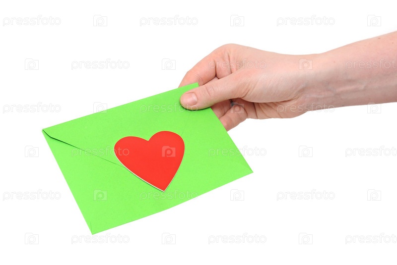 Рука с письмом - зеленый конверт и красное сердце, изолированные на белом