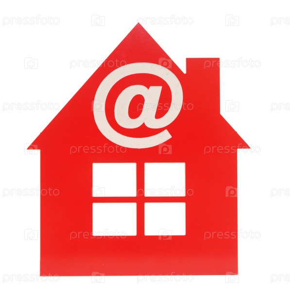 Иконка электронной почты на красный пластиковый дом на белом фоне