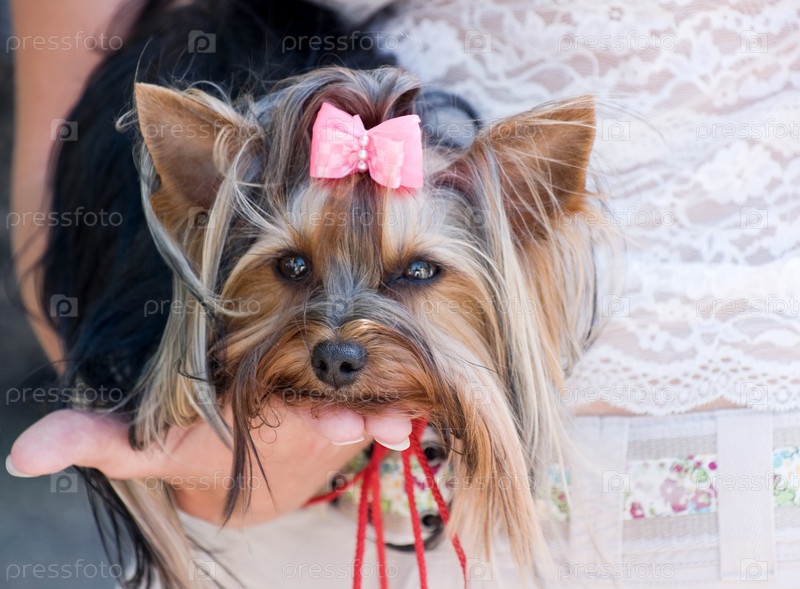 Забавный йоркширский терьер с розовыми бантиком