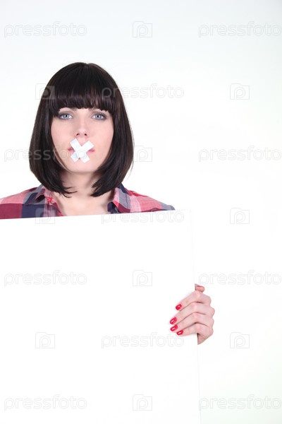 Женщина с заклеенным ртом и баннером для текста