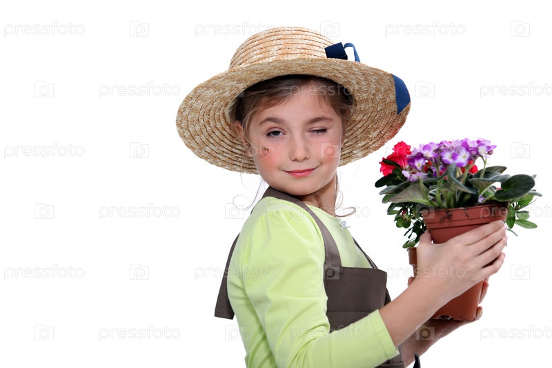 Маленькая девочка в соломенной шляпе держит горшок с цветком