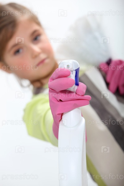Маленькая девочка распыляет чистящее средство