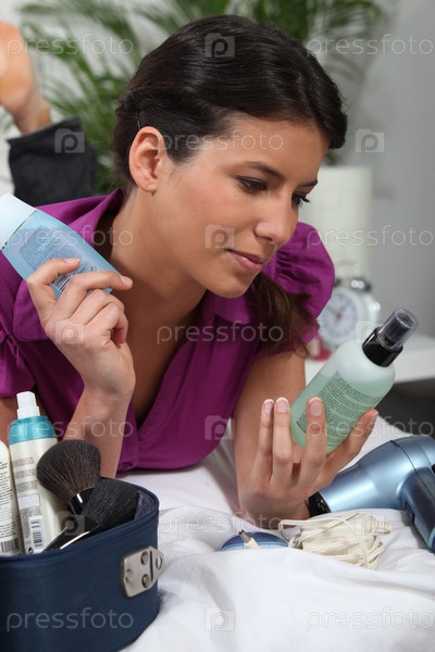 Женщина рассматривает косметические средства