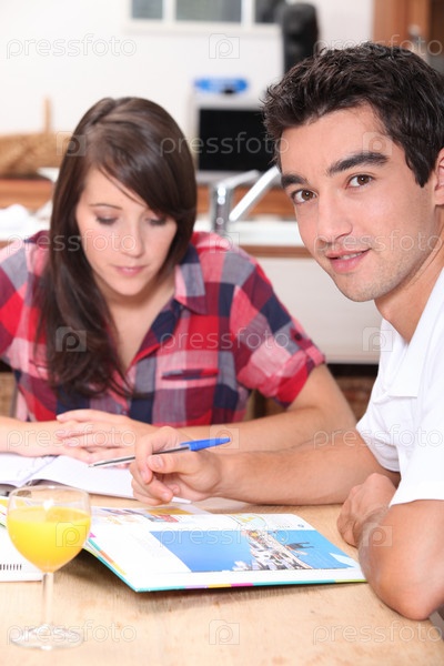 Молодая пара смотрит туристические брошюры