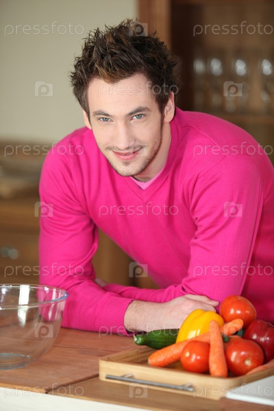 Молодой мужчина опирается на столешницу в кухне