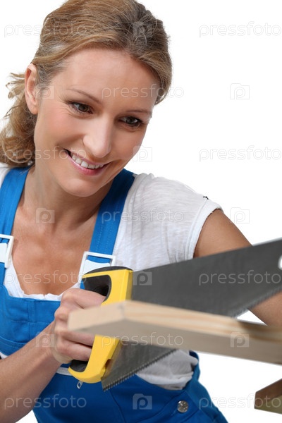 Женщина, одетая в синий комбинезон, пилит доску
