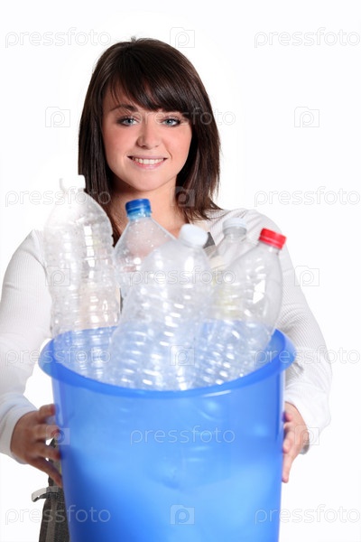 Молодая женщина утилизирует бутылки