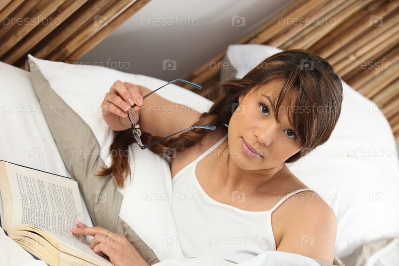 Брюнетка лежит в постели, читая книгу