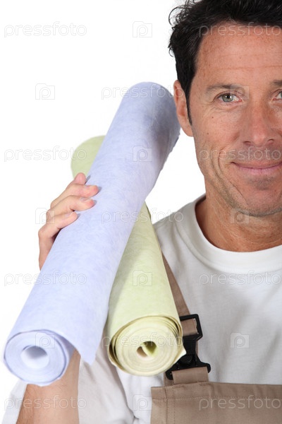 Мужчина несет рулоны обоев