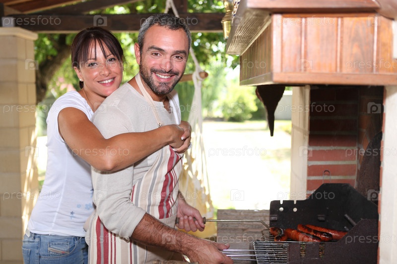 Улыбающаяся пара готовит барбекю