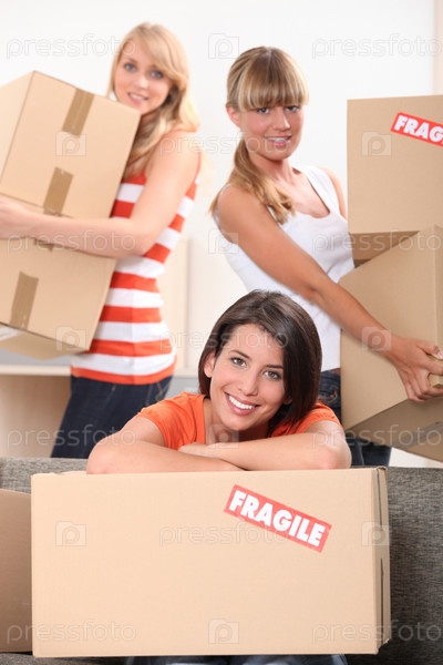 Три соседки носят коробки с надписями ХРУПКИЙ ГРУЗ