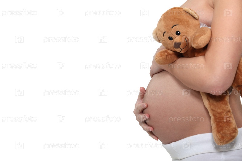 Беременная женщина держит плюшевого медвежонка