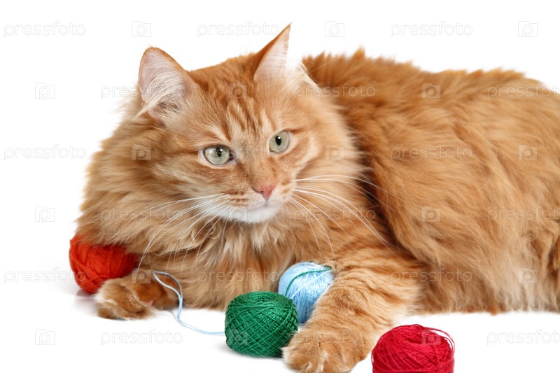 Пушистый рыжий кот с клубками
