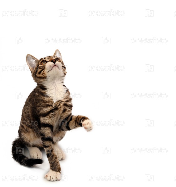Полосатый серый котенок сидит, глядя вверх