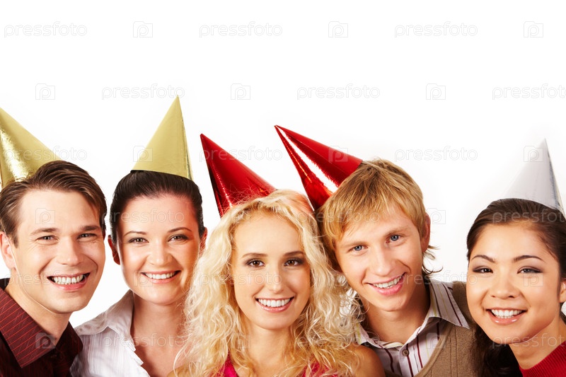 Линия веселых друзей, смотрящих в камеру с улыбками на белом фоне