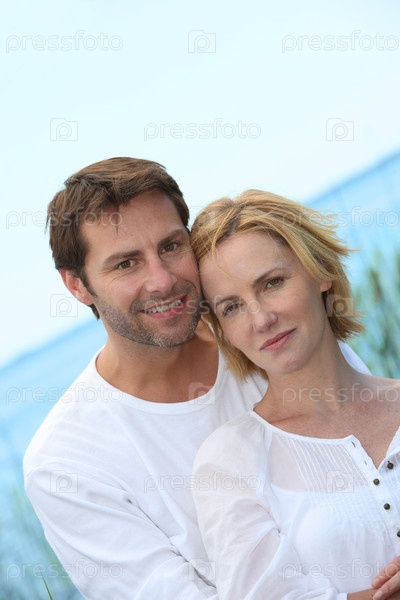 Пара стоит, обнявшись на пляже
