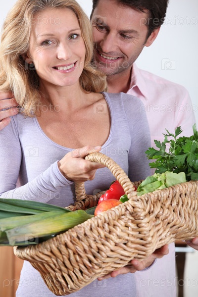 Муж смотрит на жену с овощной корзиной