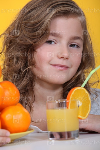 Портрет очаровательной девочки со стаканом апельсинового сока