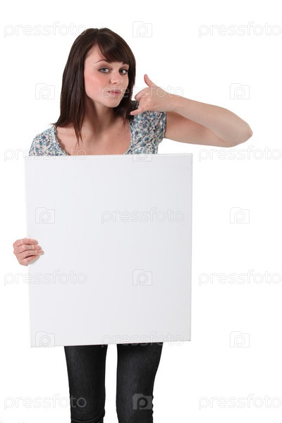 Брюнетка держит белый баннер для сообщения