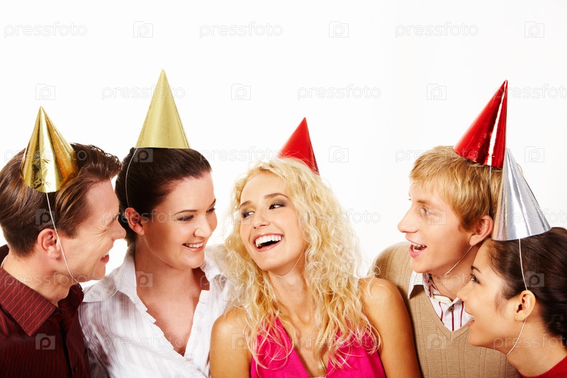 Линия веселых друзей, смотрящих в камеру с улыбками на белом фоне