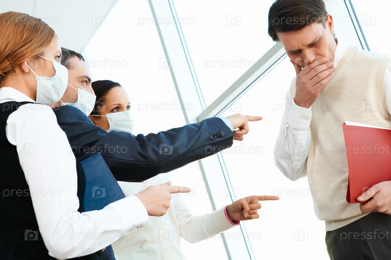 Группа коллег в защитных масках смотрит строго на человека, чихающего